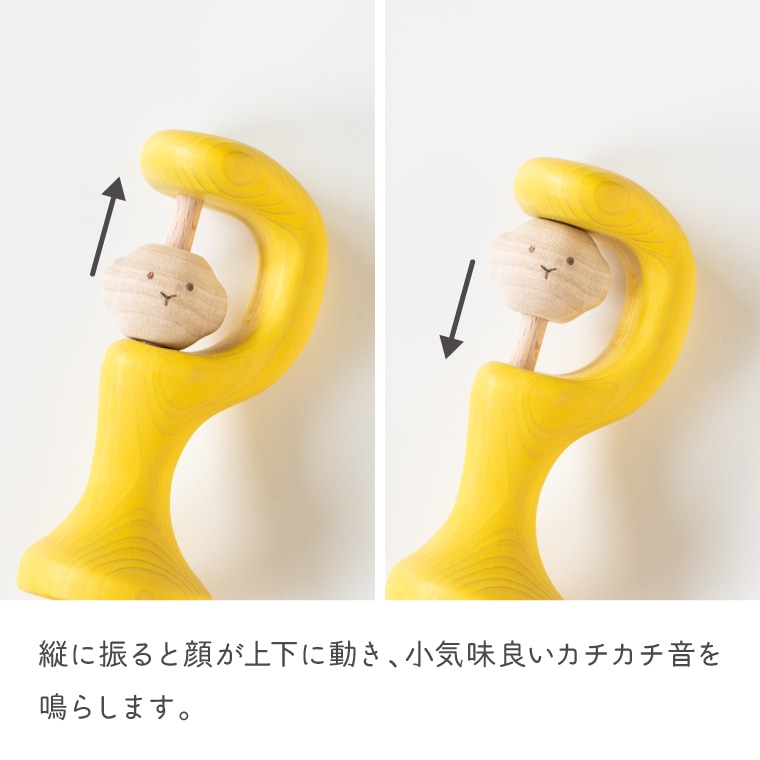 縦に振ると顔が上下に動き、やさしい木の音色を奏でます。