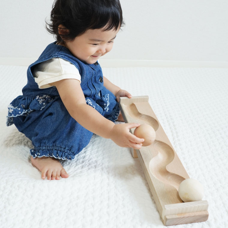 三角の支柱に乗せる位置を変えれば、ユラユラとしたシーソーから安定した滑り台に変身。傾けて遊ぶ以外にも、球を「つかんで離す」という、より簡単な転がし遊びができるようになります。お子さまの成長の段階や好みに合わせて、遊び方を変えてお楽しみください。