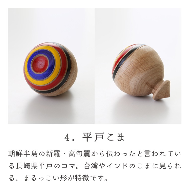 | サイズ | 博多こま:直径約5.5cm 八女こま:直径約5.5cm 平戸こま:直径約5.0cm 肥後こま:直径約5.0cm 佐世保こま:直径約5.0cm |