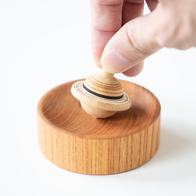 従来のコマの塗装では、木地を塗りつぶす発色の良い塗り方が基本とされています。しかし本品では、木目が土星の模様を連想させることから、球部分の線模様は、あえて木目を塗りつぶさない木地が透けて見える仕上げ方にしています。