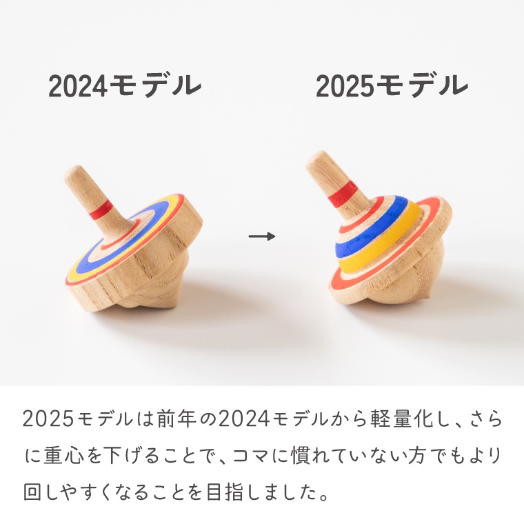 2025モデルは前年の2024モデルから軽量化し、さらに重心を下げることで、コマに慣れていない方でもより回しやすくなることを目指しました。